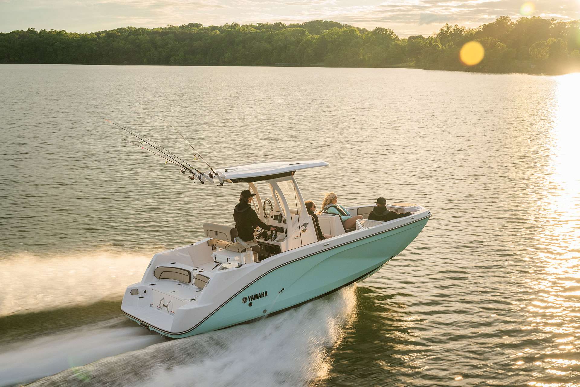 The 222 FSH Sport E's T-Top provides shade, style, and functionality all in one, with four rocket launchers aft for all your rods.